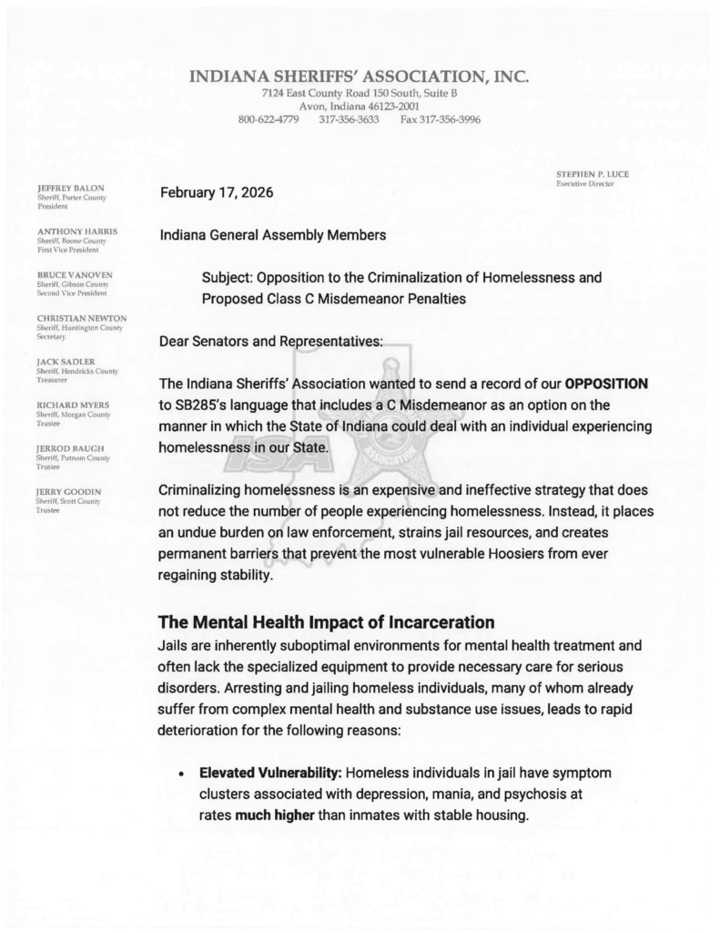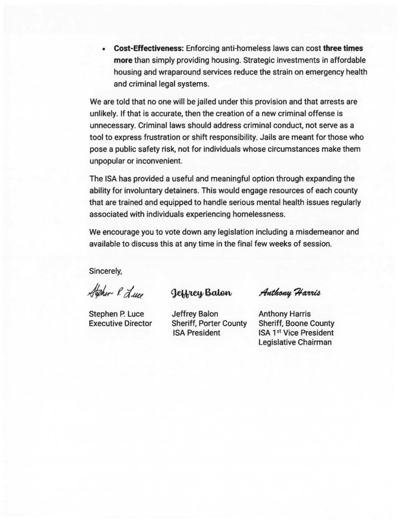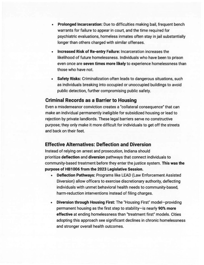 Criminalizing homelessness is not a solution. It places unnecessary burdens on law enforcement, strains limited jail resources, and makes it harder for vulnerable Hoosiers to regain stability.